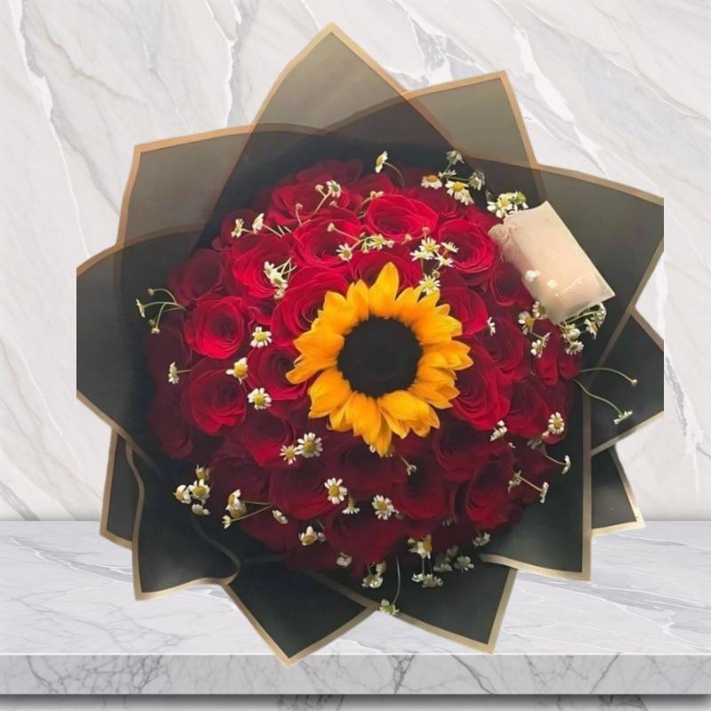 Este majestuoso bouquet combina la fuerza del girasol con la pasión de 36 rosas rojas, adornado con delicadas flores blancas. Un detalle único que evoca calidez y energía, ideal para expresar admiración y felicidad.