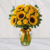 Impresionante ramillete compuesto por aproximadamente 50 girasoles frescos, acompañados de follaje verde que resalta su vitalidad. Envuelto en papel amarillo premium y atado con un lazo satinado del mismo tono, este diseño transmite fuerza, optimismo y alegría en su máxima expresión.