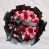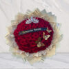 Arreglo circular elaborado con aproximadamente 100 rosas rojas frescas, cada una decorada con un brillo en el centro. Acompañado de una corona plateada, mariposas doradas y una cinta personalizada con mensaje, envuelto en elegante papel negro premium. Un detalle majestuoso que transmite pasión y compromiso profundo.