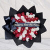 Obra maestra floral que combina el contraste de 100 rosas, entre las rosas rojas y blancas para crear un diseño impactante y sofisticado. El lazo negro de satén y la envoltura geométrica aportan un toque moderno y elegante, mientras que el sobre decorativo le agrega un detalle personal y especial. Ideal para aniversarios, propuestas o momentos significativos en los que el amor y la elegancia deben destacarse.