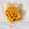 Arreglo circular compuesto por aproximadamente 70 rosas amarillas frescas acompañadas de 5 gerberas amarillas que aportan un toque de dinamismo y frescura. Decorado con mariposas metálicas doradas y envuelto en papel café oscuro, este diseño transmite energía, felicidad y optimismo en su máxima expresión.