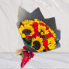 Un radiante arreglo de 12 girasoles y 70 rosas rojas, adornado con delicados detalles florales y mariposas decorativas, todo envuelto en un elegante papel negro. El diseño se completa con una cinta personalizada con mensaje, convirtiéndolo en el regalo perfecto para expresar cariño y admiración en cualquier ocasión especial.