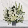 Un tributo floral que simboliza el ciclo de la vida y el descanso eterno. Este elegante diseño está compuesto por lirios, rosas y crisantemos blancos, dispuestos en una corona que transmite paz, pureza y respeto. Es ideal para expresar condolencias sinceras y honrar la memoria de un ser querido en ceremonias de despedida o homenajes solemnes. El lazo blanco que adorna esta corona añade un toque de serenidad y reflexión.
