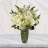 Un refinado arreglo de 20 lirios blancos presentado en un elegante jarrón de cristal. Este diseño minimalista y sofisticado es perfecto para ocasiones de paz y reflexión, cómo condolencias o eventos formales, y añade un toque de serenidad a cualquier espacio Un jarrón de cristal alto sostiene lirios blancos abiertos y capullos, acompañados de follaje verde fresco.