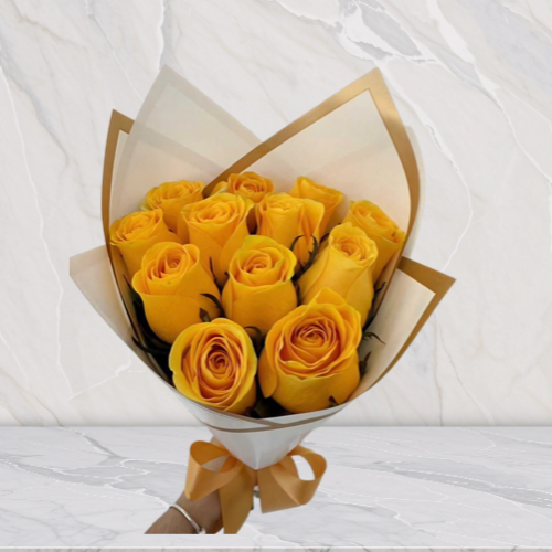 Un ramo radiante de 12 rosas amarillas que transmite alegría, cariño, admiración y amor. Su envoltura en tonos nude con borde dorado y lazo a juego resalta la elegancia y calidez de este diseño. Acompañado de delicados cupcakes decorados con rosas en crema, es el detalle perfecto para iluminar cualquier ocasión especial, expresar gratitud o celebrar momentos de felicidad compartida.
