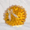 Ramillete elegante con 24 rosas amarillas frescas, acompañado de detalles únicos: una corona dorada que simboliza grandeza y dos mariposas metálicas doradas que aportan ligereza y sofisticación. Envuelto en papel blanco perlado con lazo satinado, este diseño transmite alegría, distinción y un aire real.